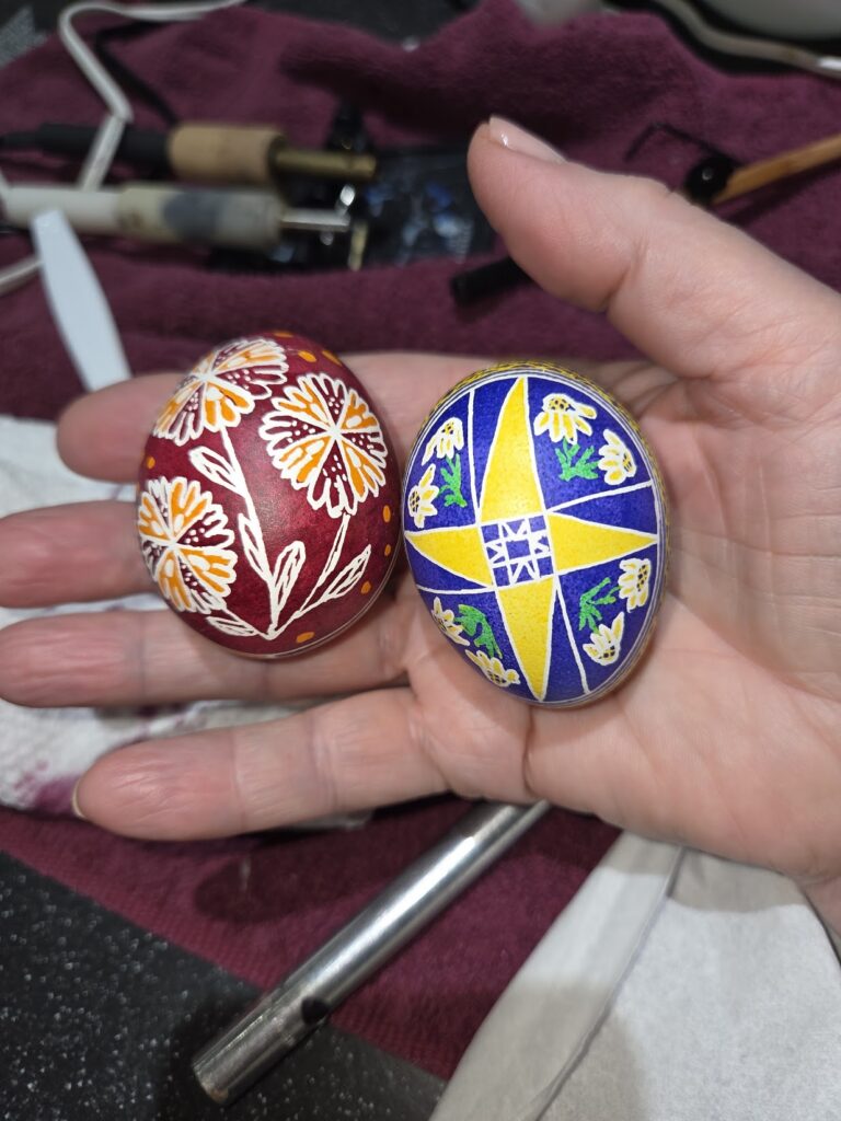 I had an urge to do an earth toned pysanka, so the flower pysanka on the left is dyed with Ukrainian Eggcessories’ all-Canadian Maple Syrup and Okanagan wine. Getting the yellow vivid can be a challenge, so for the pysanka with the pinwheel, I just dabbed on the green for the sunflower leaves with a cotton swab instead of immersing the egg. That kept my Canola Yellow bright. The background on that pysanka is actually from a final dip in purple dye to brighten up my blue.