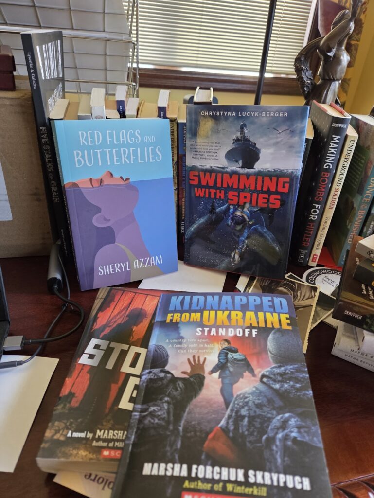I did ten virtual WRAD sessions today, plus the one on Monday night with Tashkent International School. Fantastic students, fantastic questions. Great organizing by educators! The top pic is from Highland MS, Libertyville IL. The bottom is from Allendale MS, MI. The bottom pic shows two books that I think students will enjoy reading. Sheryl Azzam’s Red Flags and Butterflies, and Chrystyna K. Lucyk-Berger’s Swimming With Spies.