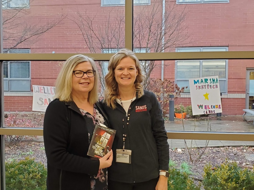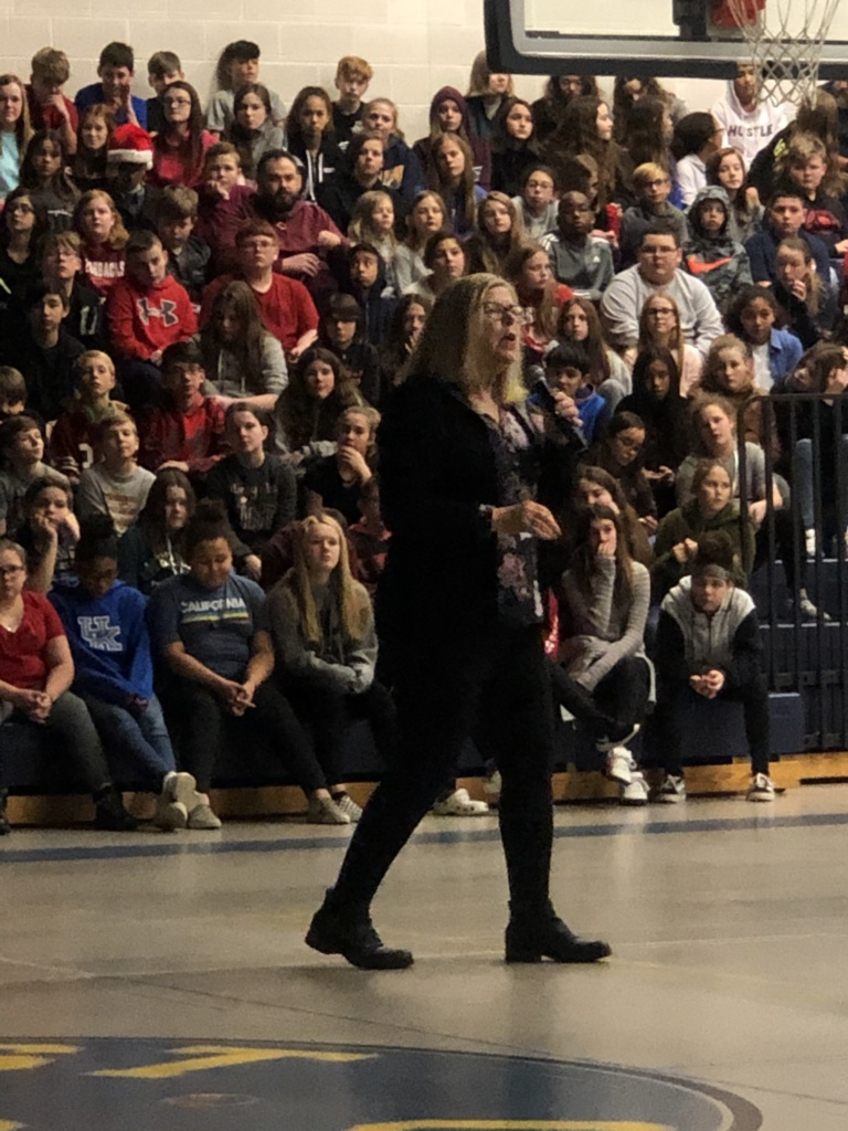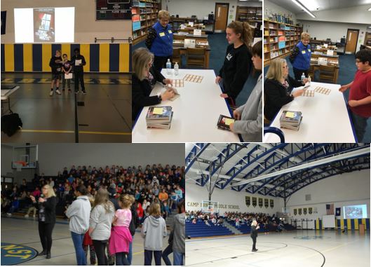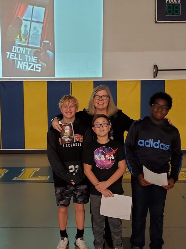 This avid reader at Sands Montessori saved a spot on her cast for me.This is me with Media Specialist Robyn Appino of Sands Montessori. I was honored by a warm welcome and many great questions.These three students did a fine introduction to 800 of their peers for my visit to Camp Ernst MS in Burlington KY. It takes a LOT of courage to stand in front of your peers to do that. Thank you!800 students sat on bleachers on opposite sides of the auditorium, which made it an interesting experience for presenting. I ended up twirling a lot so I could see individual students’ faces.