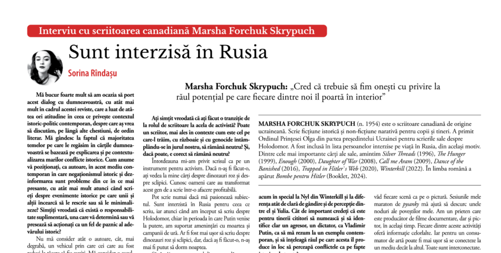 Winterkill, my Holodomor novel, is being published in a Romanian and English edition by Booklet Romania, for distribution in Romania and the Republic of Moldova. I was contacted by Sorina Rîndașu, a writer in Romania, and also the proofreader for this edition of my novel. She asked if she could interview me for Timpul, saying, “The magazine is led by two very courageous cultural figures: Dumitru Crudu, a novelist and an active activist on the issue of the war started by dictator Vladimir Putin against Ukraine, and Maria Ivanov, a writer and cultural journalist.”