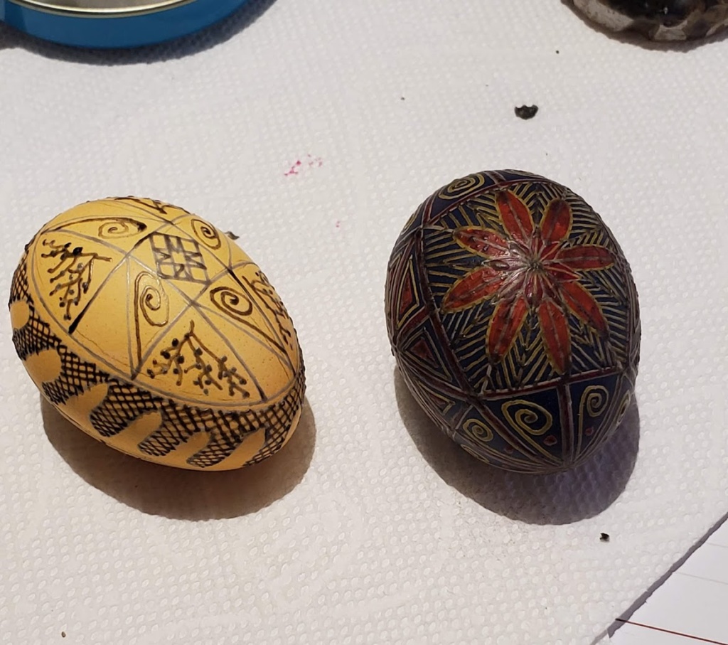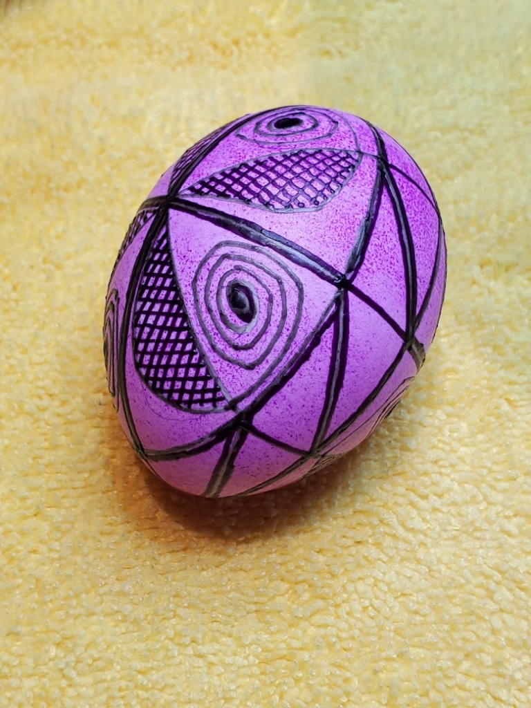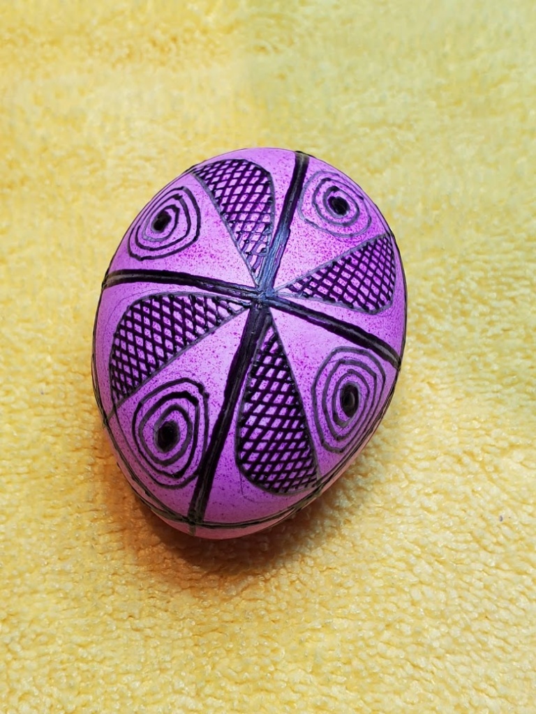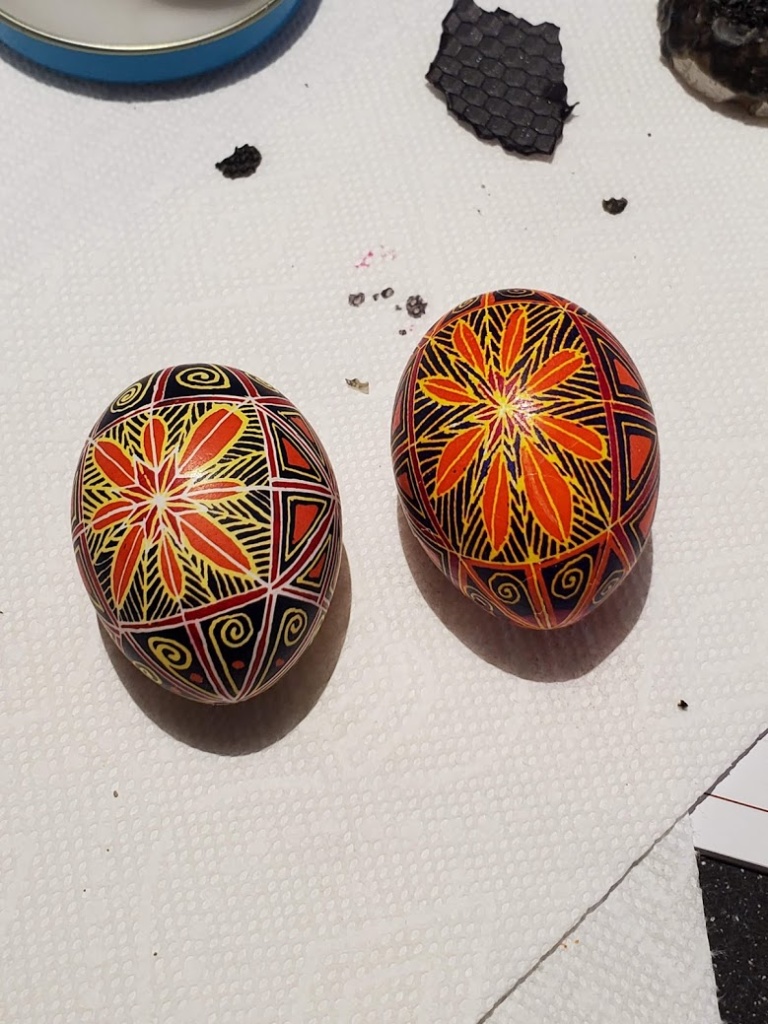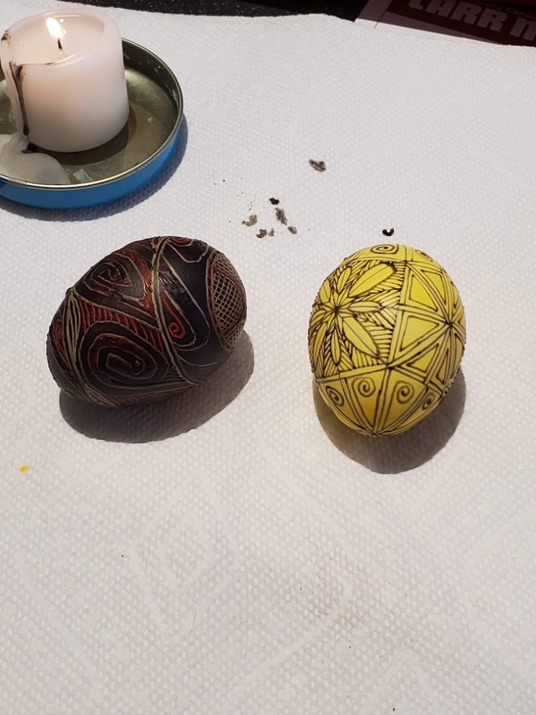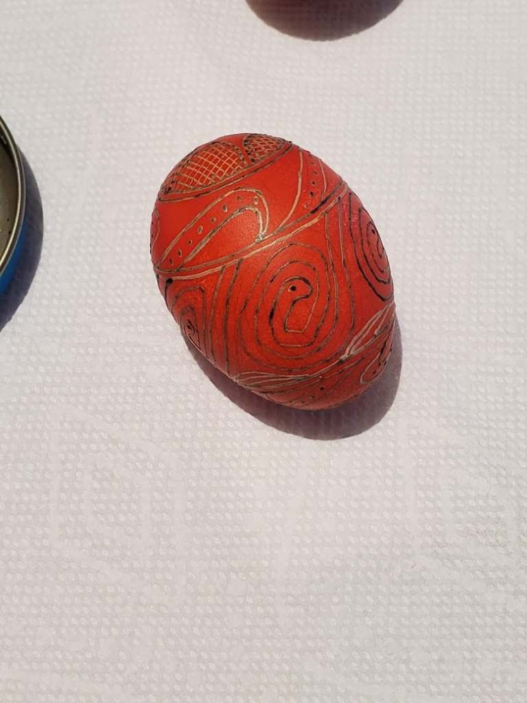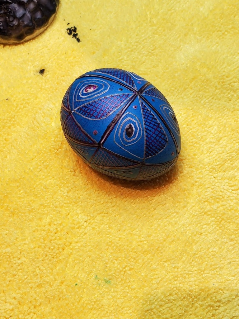 Here’s the first egg finished, plus the second egg out of the orange dye.